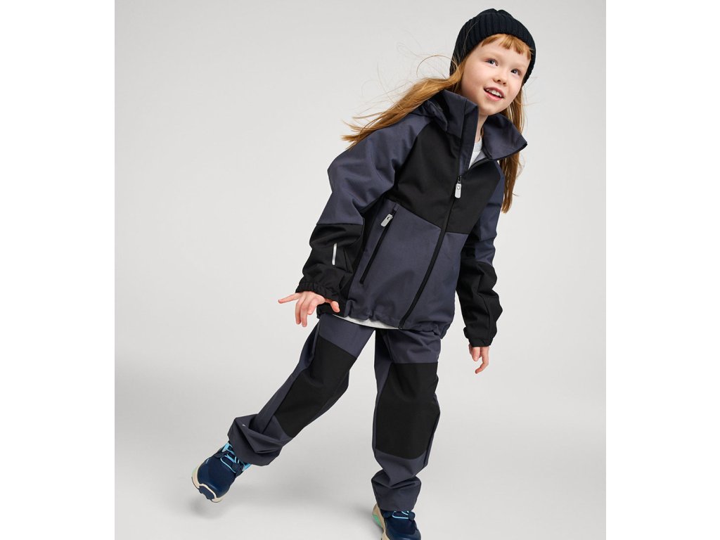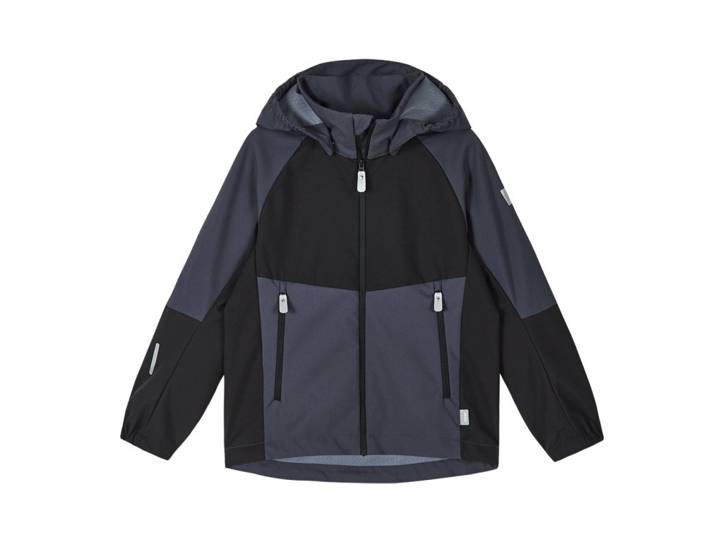Softshellová bunda Reima v dvoudílné barevné kombinaci černé a tmavě šedé.