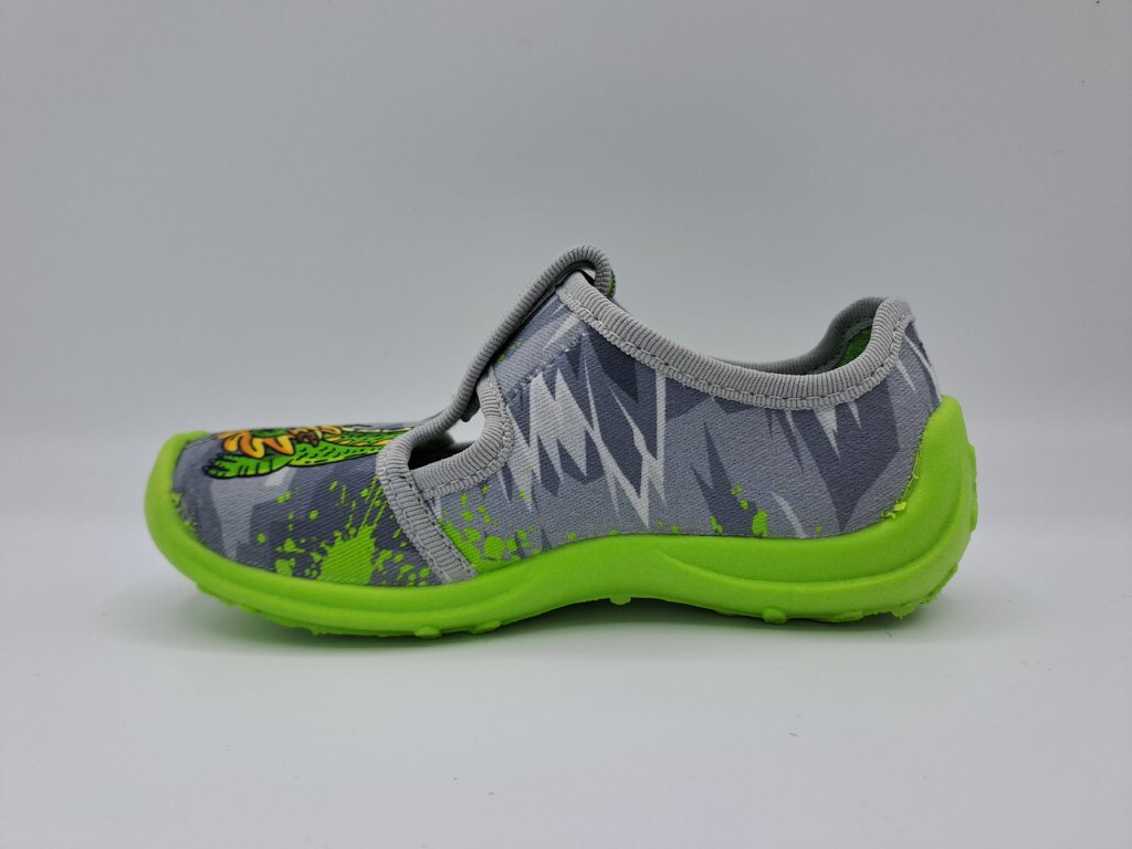 Nízké textilní bačkory Fischer mají pevný opatek, zapínání na suchý zip, bez vkládací stélky.
